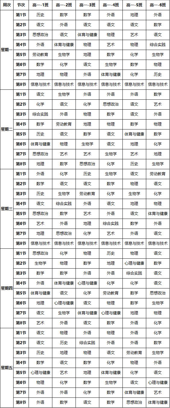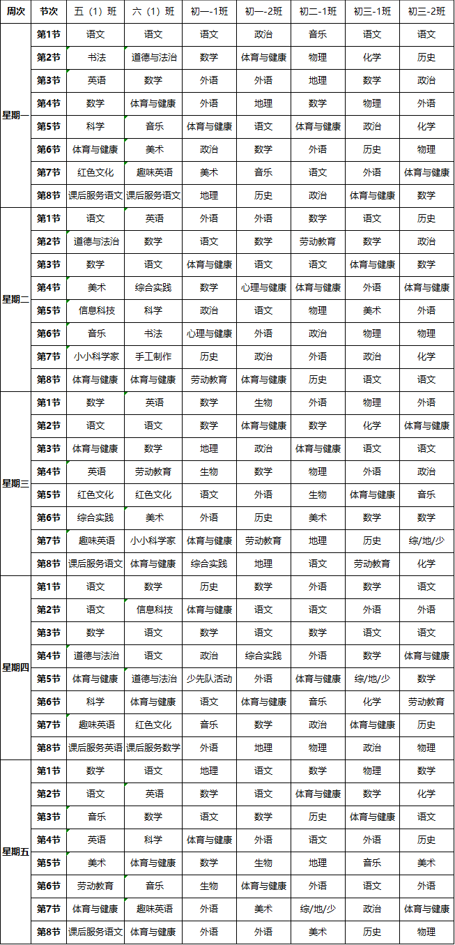 按照省教育厅《关于开展中小学体育美育劳动教育“晒课表”的通知》要求,严格落实体育美育劳动教育课程开设刚性要求,按照新标准开齐开足上好体育美育劳动教育课。我校严格落实“晒课表”制度,开齐开足音体美劳课程。现将我校课表公示如下: