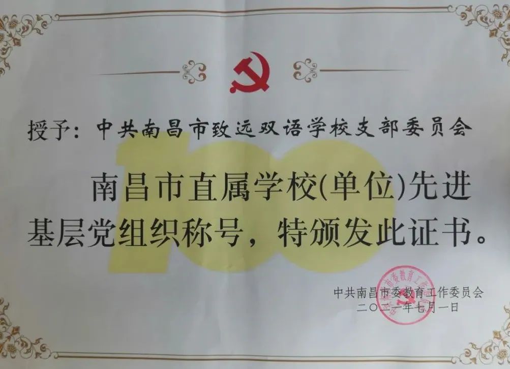 7月1日下午,南昌市直属学校(单位)优秀共产党员、优秀党务工作者和先进基层党组织表彰大会在南昌二中初中部一楼学术报告厅隆重召开。在建党100周年之际,中共南昌市致远双语学校支部委员会喜获“全市直属学校(单位)先进基层党组织”荣誉称号。近年来,南昌市致远双语学校党支部在市委教育工委的正确领导下,坚持以习近平新时代中国特色社会主义思想为指导,突出全面从严治党管党要求,紧扣“服务中心、建设队伍”两大任务,不断抓管理、提素质,打造了一支党性纯洁、政治坚定、纪律严明、作风过硬的新时代高质量党员队伍。通过“五措并举”强化党的建设,实现学校党建与教育教学“双推进”、“共提升”。南昌致远双语学校党支部将不忘初心、牢记使命,珍惜荣耀、再接再厉,持续推进党史学习教育走心走深走实,以优异成绩向建党100周年献礼!