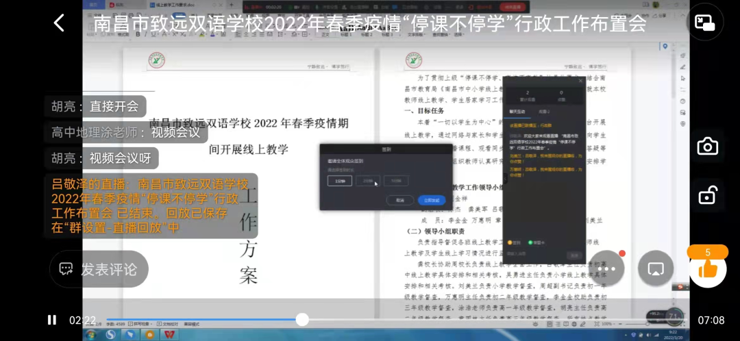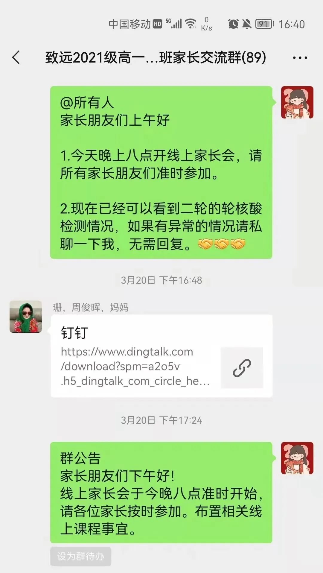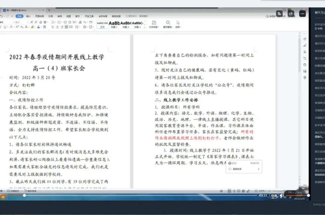 为了积极落实学校校本线上教学方案要求,做到“一个不少,一个不落”。3月20日晚上8:00,全体班主任利用钉钉软件召开线上家长会,积极调动家长力量,确保“停课不停学”的线上教学起到实效。