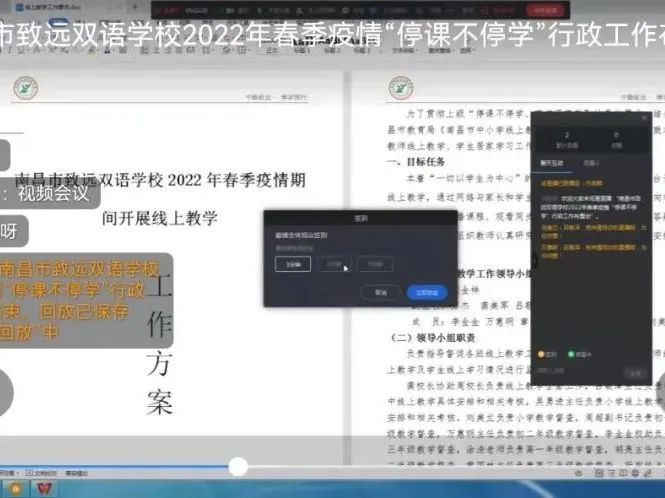3月20日上午9:30,南昌市致远双语学校召集全体中层及以上干部召开教育教学紧急线上调度会,交流当前疫情防控形势下如何保障学校正常的教育教学工作。各部门从学校教育教学的线上管理体系、学生学习管理流程、班级管理、课堂管理、作业讲评这几大方面入手,全面谋划、务求实效,集中资源抓好教学常规管理,在严格执行各项防控措施前提下,克服重重困难,保证教育教学活动有序实施,最后制定了符合本校实际且可操性强的“校本线上教学方案”。