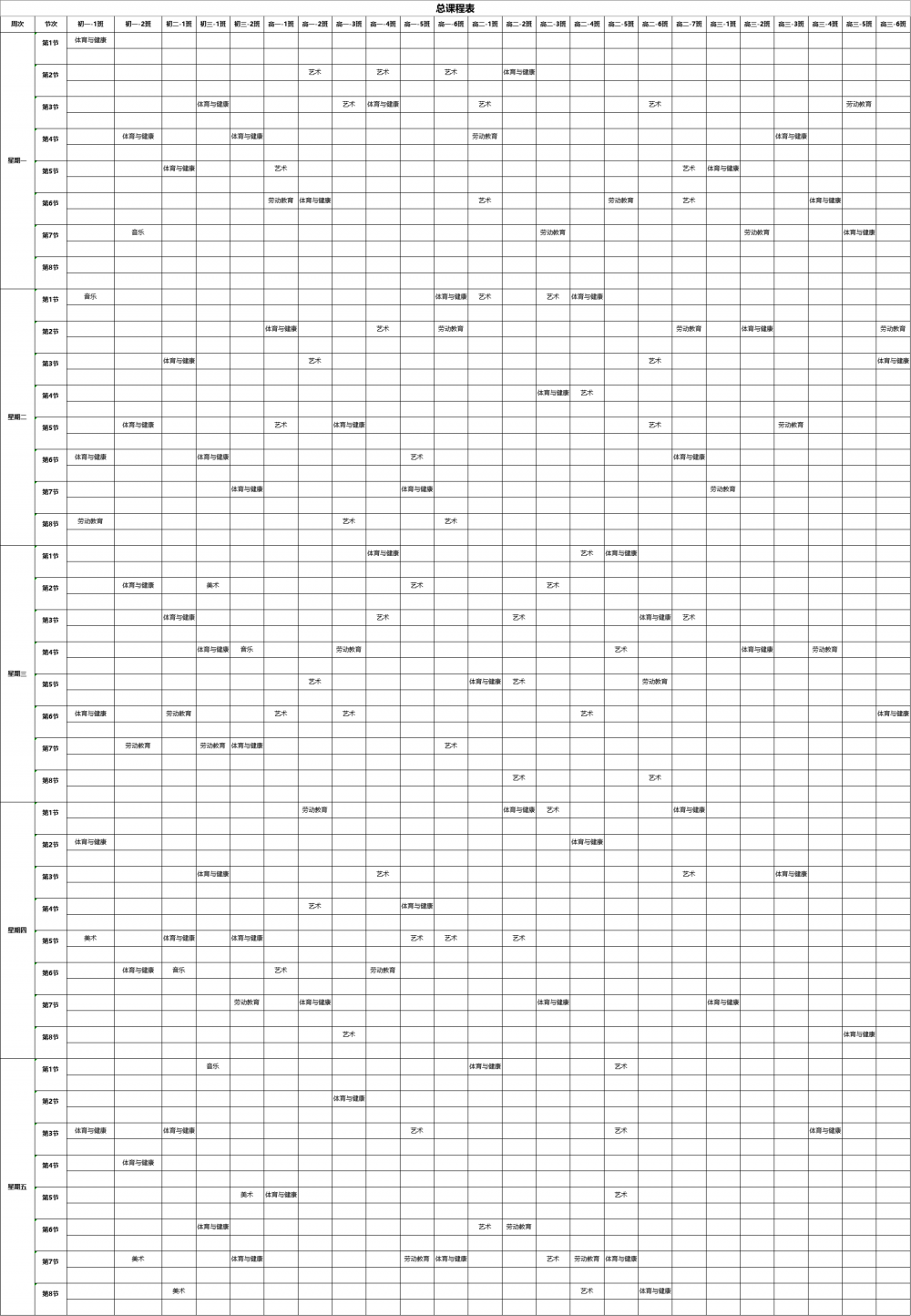 按照省教育厅《关于开展中小学体育美育劳动教育“晒课表”的通知》要求,严格落实体育美育劳动教育课程开设刚性要求,按照新标准开齐开足上好体育美育劳动教育课。我校严格落实“晒课表”制度,开齐开足音体美劳课程。现将我校课表公示如下: