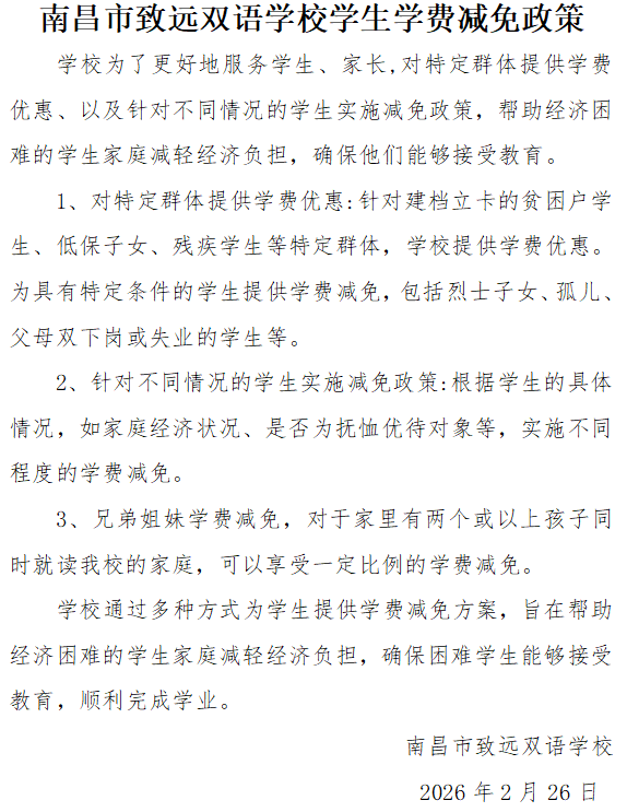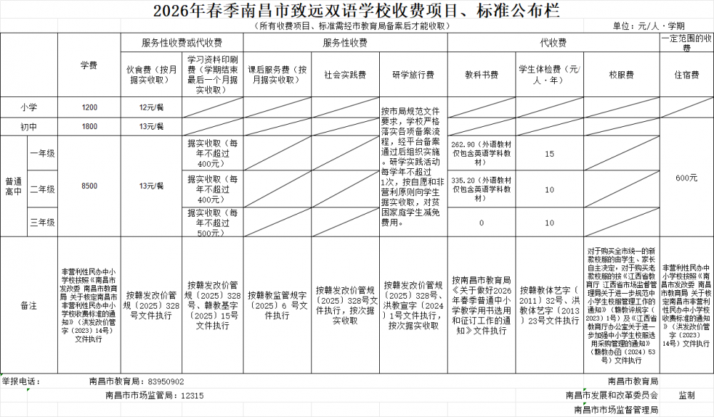 南昌市致远双语2026年春季收费公示